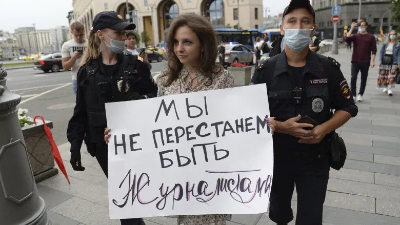 When several journalists picketed FSB headquarters holding signs that read “Journalism is not a Crime” and “You are Afraid of the Truth,” they were detained by the FSB.