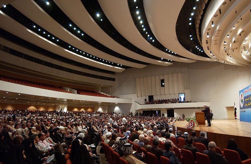 Featured image: Inside of the Baghdad Convention Center, where the Council of Representatives of Iraq meets. This photo shows delegates from all over Iraq convening for the Iraqi National Conference. | By James Gordon [CC BY 2.0], via Wikimedia Commons