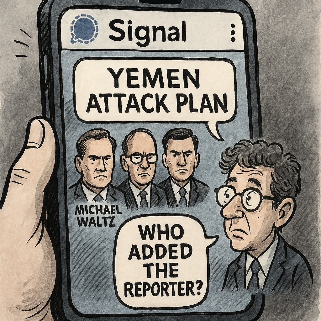 You’d think someone with “national security” in their job title would treat comms about kinetic operations like nuclear football—not like a group text inviting buddies to Vegas. But no. Waltz fat-fingered a Signal chat and added The Atlantic’s editor-in-chief, Jeffrey Goldberg, to a war-planning thread like he was looping in his Uber driver.