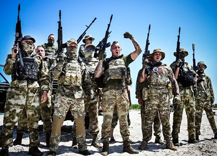 According to Ukrainian intelligence sources, Española pays its volunteers $2,565 per month, with a minimum, six-month service contract, and an insurance policy of $32,400 for serious injury, or $54,000 death benefit for family members. They recruit mainly from the hardcore, Russian soccer clubs, and have a strict code of conduct against the use of alcoholic drinks. Their motto is, “One for all, and all for one!”